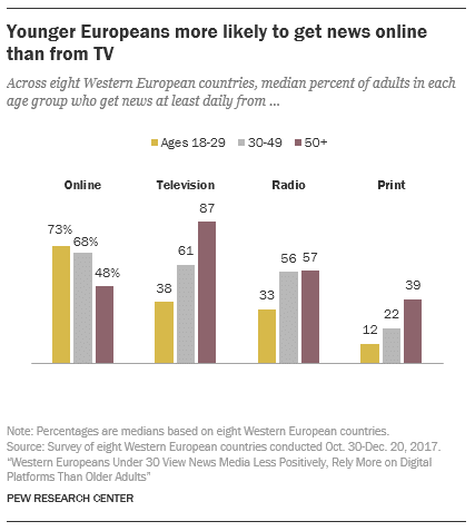 New research from the Pew Research Center leads with the headline that: “Western Europeans under 30 view news media less positively, and rely more on digital platforms, than older adults.”