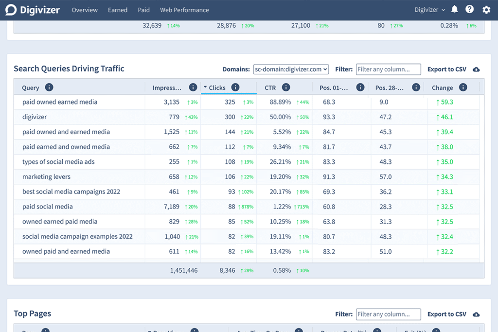 - Page Ranking: where your webpages rank on keyword SERPs (see below Top Page insights for Digivizer’s blog)