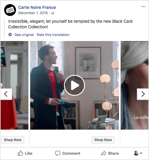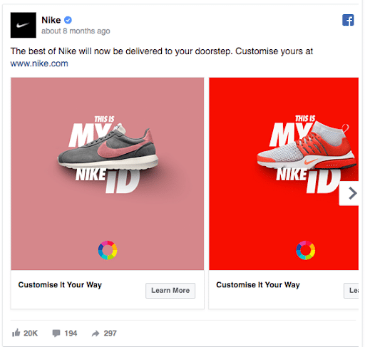 Carousel Ads are awesome for telling a deeper story about your brand. You can show more in this ad format than arguably any other and take your audience on an interactive ride. Available for Facebook, Instagram, Messenger and Audience Network, most carousel ad formats allow you to showcase up to 10 images or videos within a single carousel, each with its own individual link and CTA button. You can also remove CTAs altogether for a cleaner look. Facebook will even optimise the order of the carousel images, based on each card’s performance, but if you’re using this ad format to tell a sequential story, naturally you should opt-out of this automated feature.