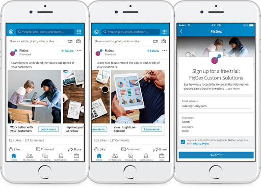 On LinkedIn, you can run carousel ads that tell a story and draw audiences towards signing up for lead forms.