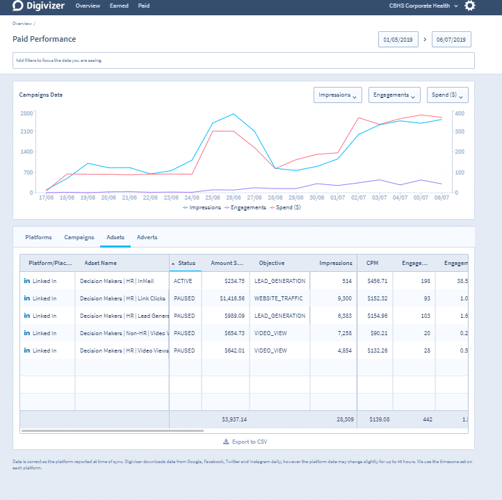 With the Digivizer platform, you can see the different types of campaigns and ad sets, run with differing objectives and budget spends to date, for whatever date period you choose.