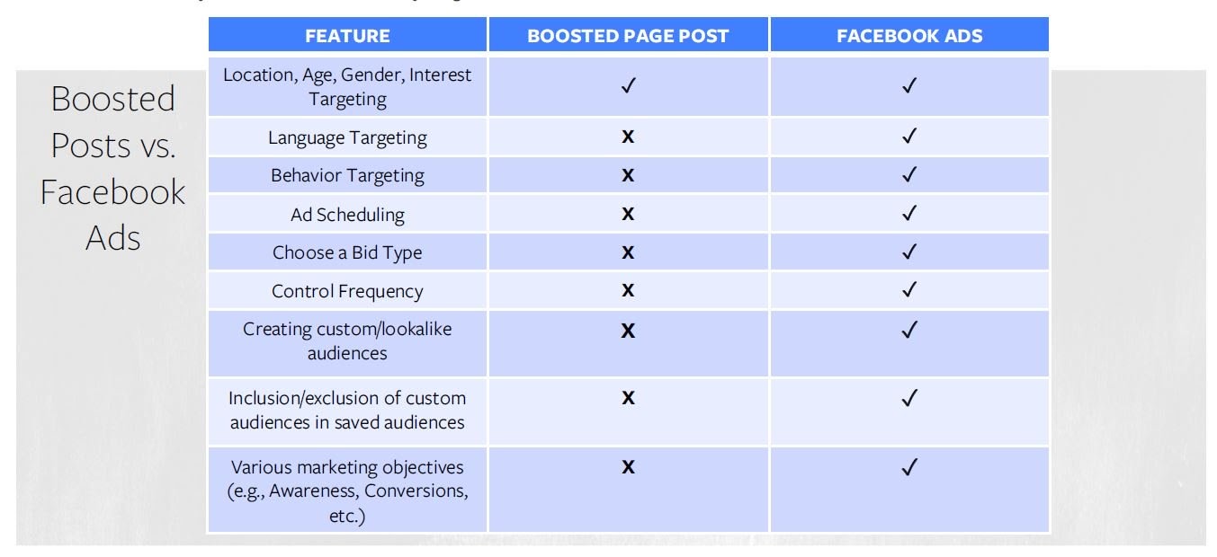 It might look like a good deal, but boosting a post gives you fewer choices for marketing objectives, audience targeting, and formatting than a regular ad. But you should be aware of boosted posts anyway, because they are an option, especially for simple brand awareness goals like getting more reach for your posts and ads. Just be sure it’s worth the money before you hit the ‘boost’ button rather than the ‘create ad’ button.