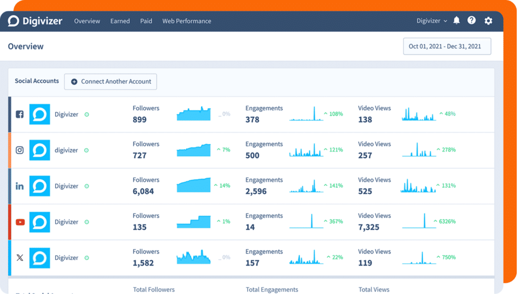 When you first connect your account, including in trial, you will immediately see 30 days of data across your organic, paid and web accounts. Earned Media starts gathering from the time you connect and choose your hashtag to be monitored. Whilst your Digivizer plan is paid up, all your insights will continue to build over time. You can then: